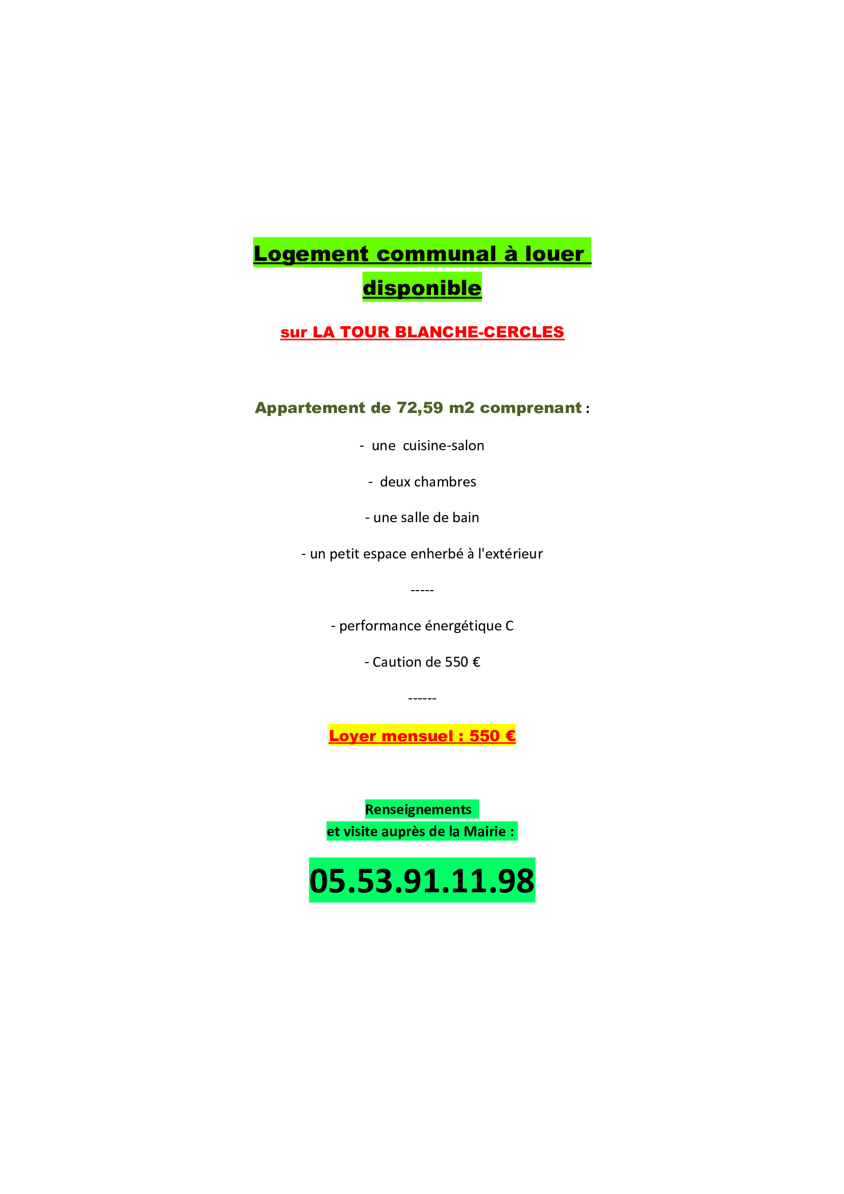 Logement à louer sur La Tour Blanche - Cercles